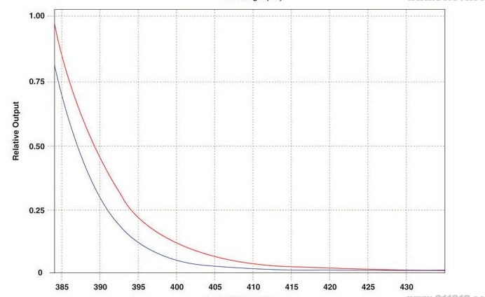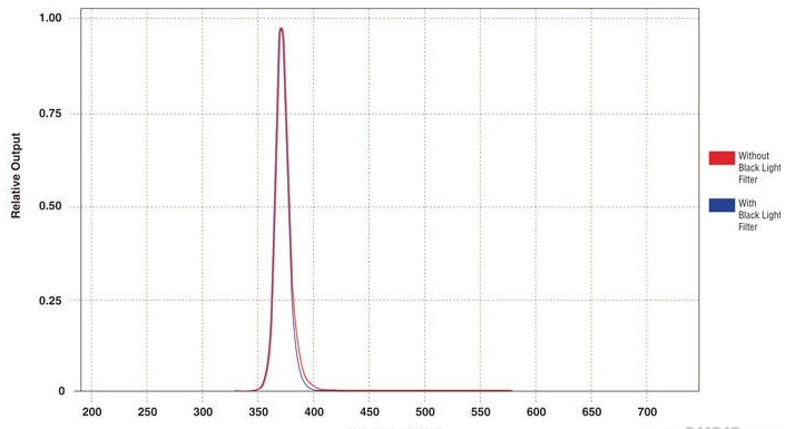 名義紫外照射 OPTI-LUX™ 365典型波長輸出圖,紅色為不配黑色濾色片的波長輸出,藍色為配黑色濾色片的濾長輸出,峰值都是365nm。 配及不配內置黑色濾色片時波長輸出 當 OPTI-LUX™ 365的波長進入可見光范圍時,在400nm波長時,配有黑色濾色片可顯著降低強度達50%。
